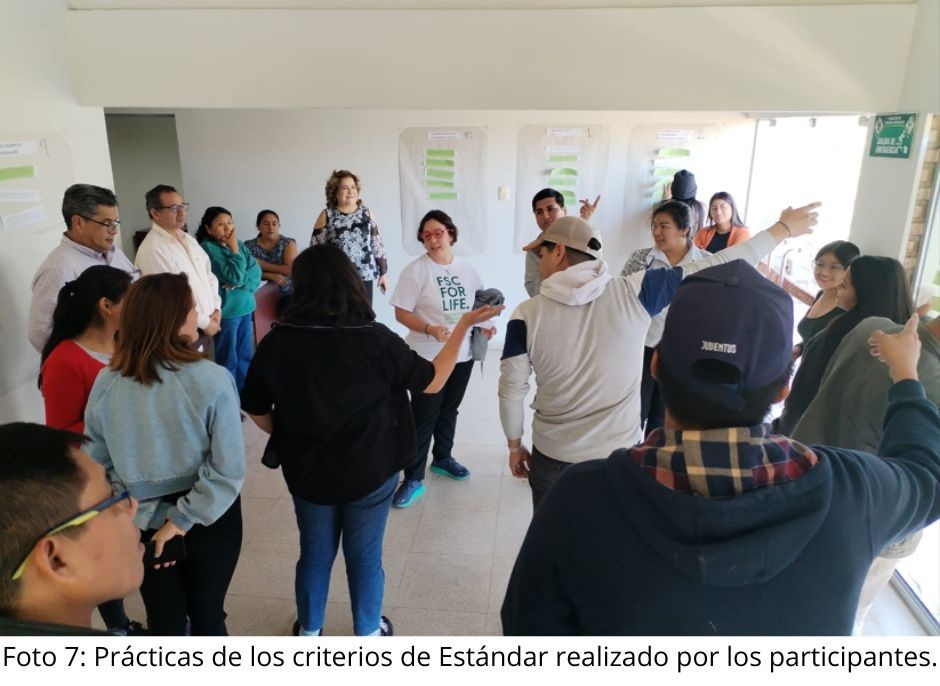 El ciclo de talleres para la actualización del Estándar en Bolivia, reunió a un total de 184 participantes, incluidos profesionales del sector, emprendedores, representantes comunitarios, empresas forestales, docentes universitarios y estudiantes. Los primeros talleres presenciales talleres se llevaron a cabo en Santa Cruz en la Sociedad de Ingenieros y en Concepción en la Sede de los Ganaderos la parte teórica y la práctica de campo en la Comunidad Palmarito de la Frontera (Foto 2), que estaba a cargo de la Gerente de Políticas de Latinoamérica, implementando una metodología participativa y dinámica, para la mejor comprensión de los cambios e inclusiones determinadas por el FSC Internacional.