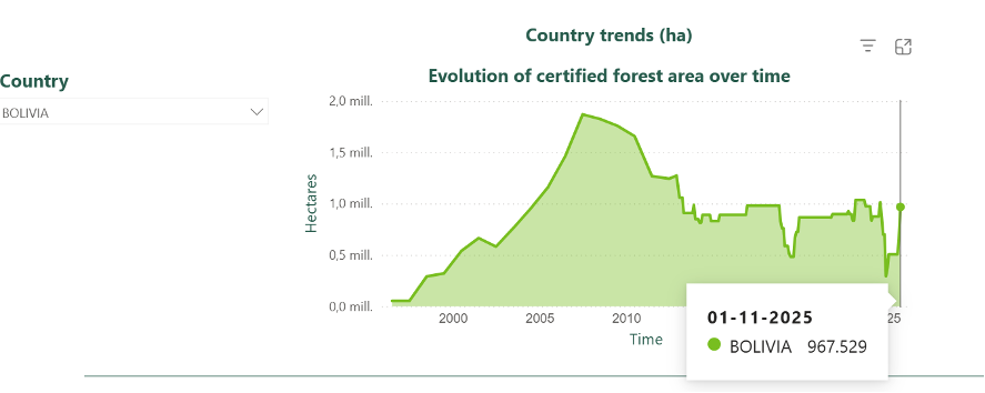 Bolivia destaca entre los países de Latinoamérica por tener la segunda mayor superficie de bosques naturales con manejo forestal certificado por el FSC, actualmente se tiene una superficie de 1.035.816 hectáreas, distribuidas en ATE, Propiedad Privada y Comunidades.