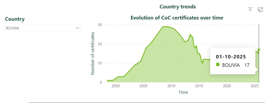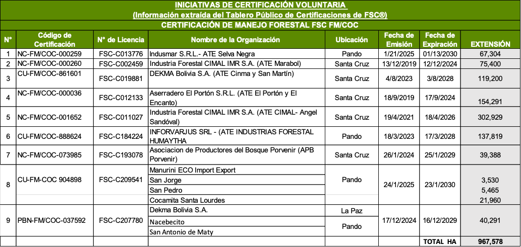 Una lista actualizada al 30 de Junio de 2023 de organizaciones bolivianas con certificación FSC se encuentra en los siguientes archivos:
